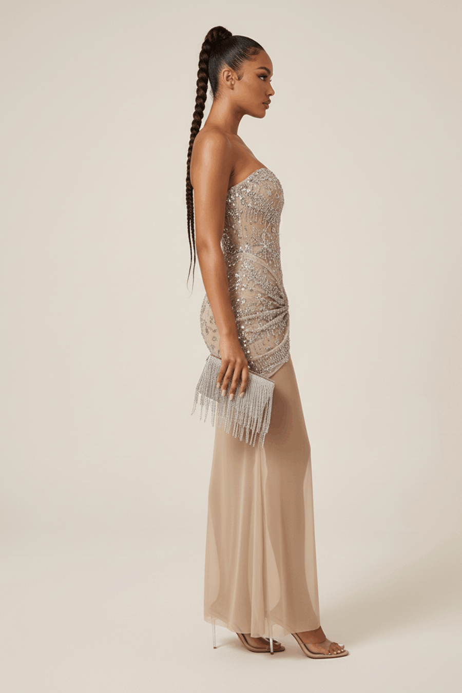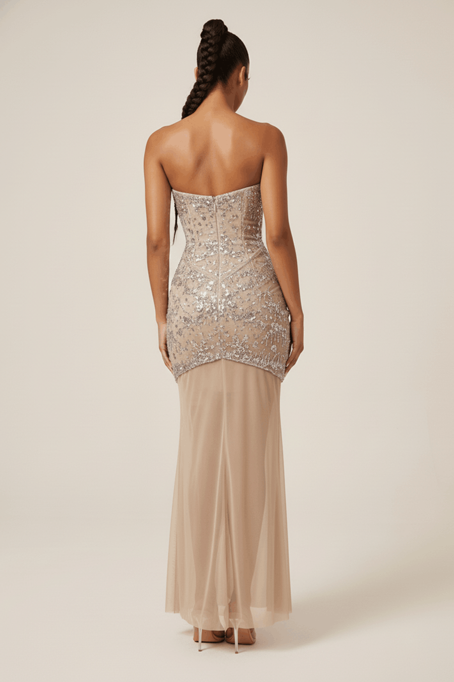 Dieses Maxikleid besteht aus einem raffinierten, nudefarbenen Tüll, der mit Perlen und champagnerfarbenen Pailletten in einem komplizierten, von Blumen inspirierten Muster aufwändig verziert ist. Es hat einen strukturierten, trägerlosen, herzförmigen Ausschnitt und eine charakteristische Rüsche an der Taille, die eine schmeichelhafte, konturierte Silhouette schafft. Das bodenlange Modell hat einen ausgestellten Saum für ein elegantes Finish und einen dezenten Reißverschluss am Rücken für einen sicheren Sitz. Dieses strahlende Kleid ist die perfekte Wahl für eine formelle Gala, eine edle Hochzeit oder ein glamouröses Event mit rotem Teppich.
