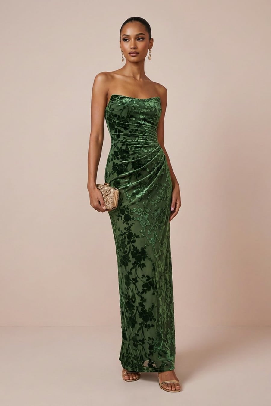 Vestido de invitada de boda sin tirantes en terciopelo verde oscuro quemado