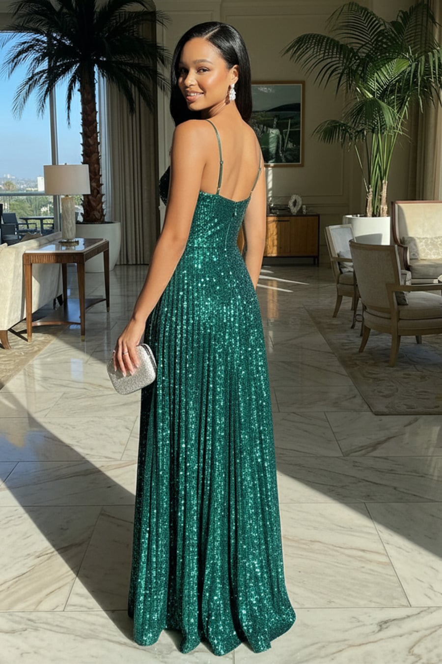 Este vestido largo de lentejuelas verdes es realmente impresionante; las lentejuelas del corpiño brillan y centellean bajo las luces.