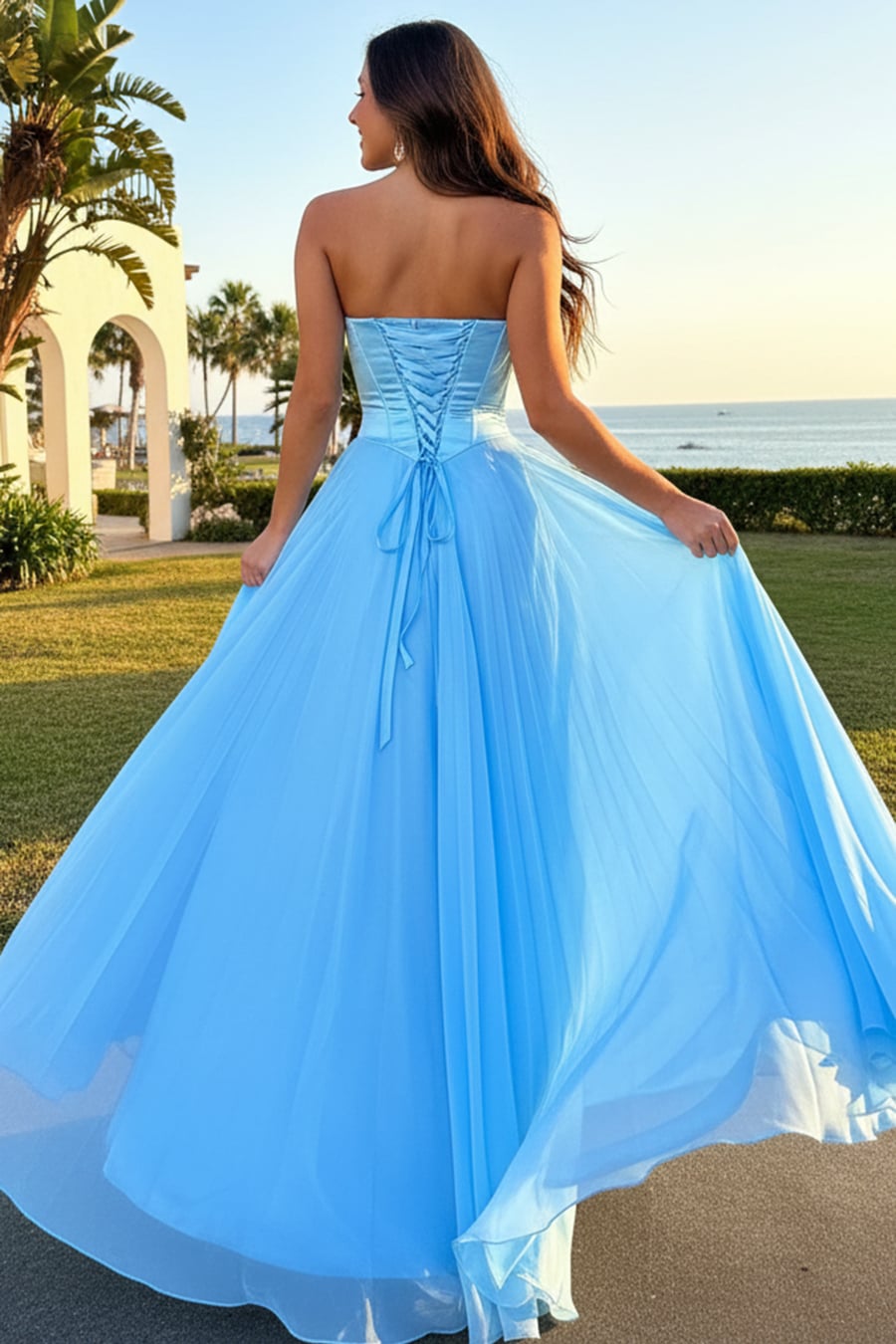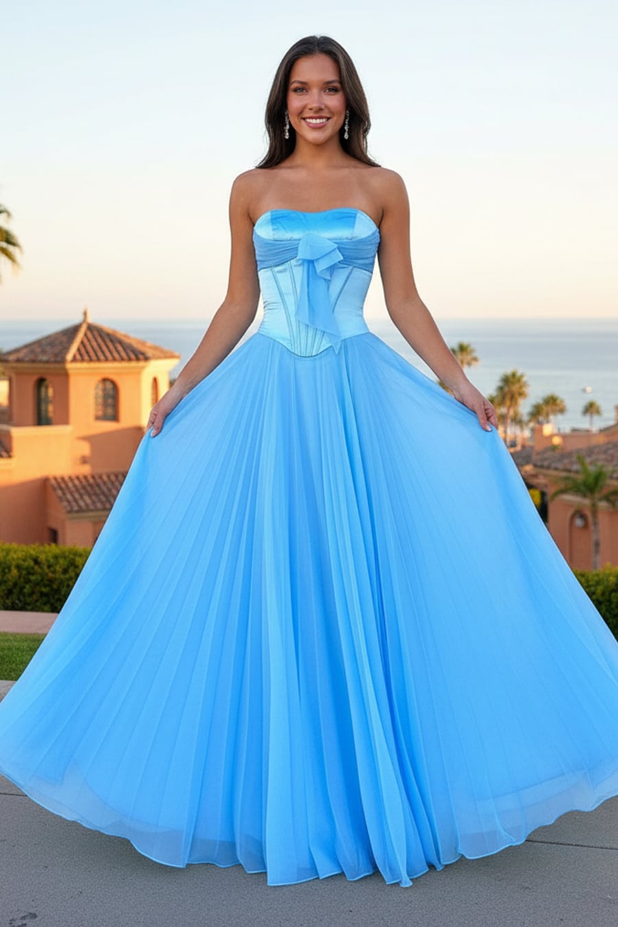 Robe de cérémonie en mousseline plissée et sans bretelles, bleu