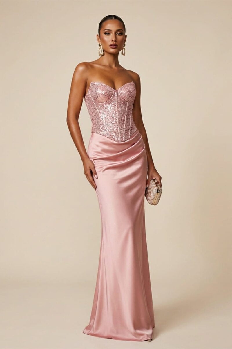 Cette robe sophistiquée, qui s'étend jusqu'au sol, présente un éblouissant corsage brodé de paillettes associé à une jupe en satin lustré pour un look luxueux très contrasté. Elle est dotée d'un corset sans bretelles structuré, d'un décolleté flatteur en forme de cœur et d'une élégante armature qui se fond dans une silhouette de fourreau drapée et ajustée. Ce modèle intemporel est doté d'une fermeture à glissière invisible au dos et d'un ourlet élégant qui descend jusqu'au sol, pour une allure soignée sur le tapis rouge. Cette robe glamour est le choix idéal pour un cocktail haut de gamme, une soirée chic ou une invitée de mariage sophistiquée.
