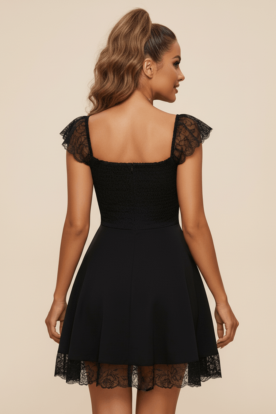 This elegant mini dress features a luxurious black charmeuse body that offers a soft, silky luster, beautifully accented by delicate floral lace flutter sleeves and a scalloped hem. It has a flattering square neckline with subtle ruched detailing on the bust and a smocked back panel that leads into a playful fit and flare silhouette. The chic design is finished with a discreet back zipper and a structured waistline for a polished and feminine look. This timeless dress is a perfect choice for a cocktail party, a semi-formal dinner, or a stylish evening event.