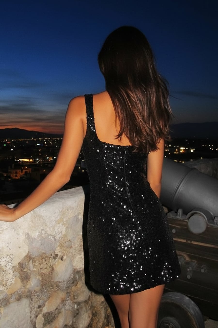 This chic mini dress features a shimmering allover sequin finish that catches the light from every angle. It has a modern square neckline, wide supportive straps, and a subtly structured fit that flows into a flirty mini-length hem with a small side slit for added movement. The sleek silhouette and classic black hue combine for a look that is both timeless and bold. This sparkling dress is the perfect choice for a glamorous New Year’s Eve party, a night out at a rooftop bar, or a festive cocktail event.