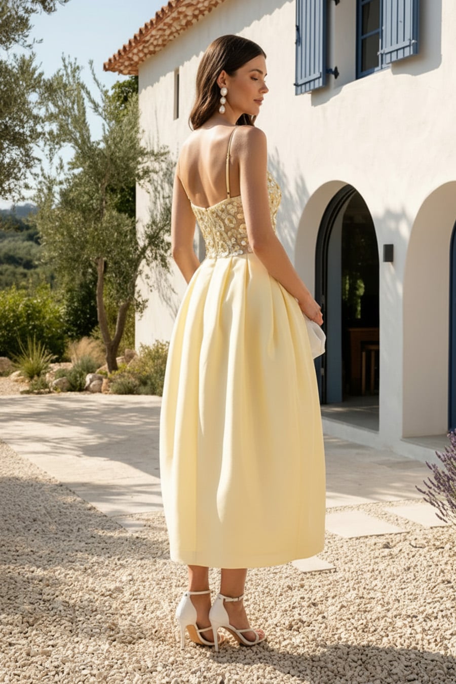 This yellow midi dress is crafted from a stunning combination of shimmering sequins and premium crepe fabric. The bodice features intricate sequin floral embroidery for a glamorous touch, while the crepe skirt is artfully tailored into a voluminous bubble hem silhouette. Designed with a flattering V-neckline and delicate adjustable spaghetti straps, this sun-kissed gown offers a unique blend of vintage charm and modern elegance, making it an ideal choice for bridal showers, garden parties, or cocktail events.